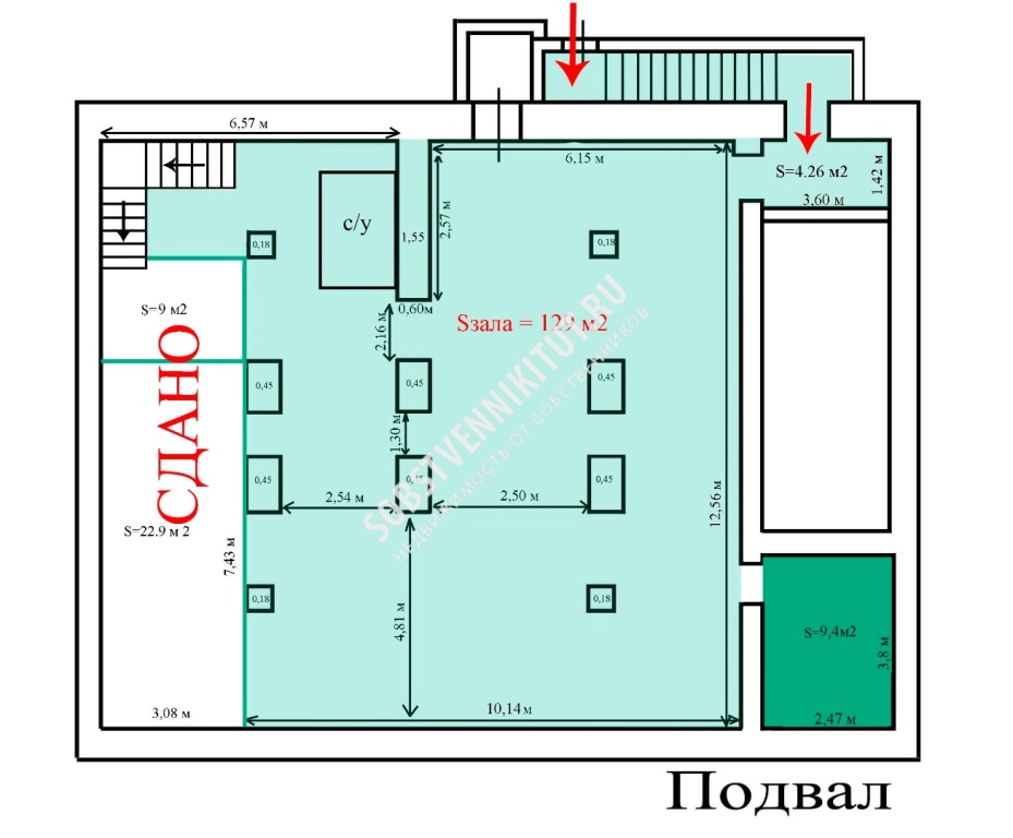 Помещение, правильной квадратной формы, имеет отдельный вход со двора здания, ведущий только в это помещение, выделенный сан/узел, высота потолков 2,5 м